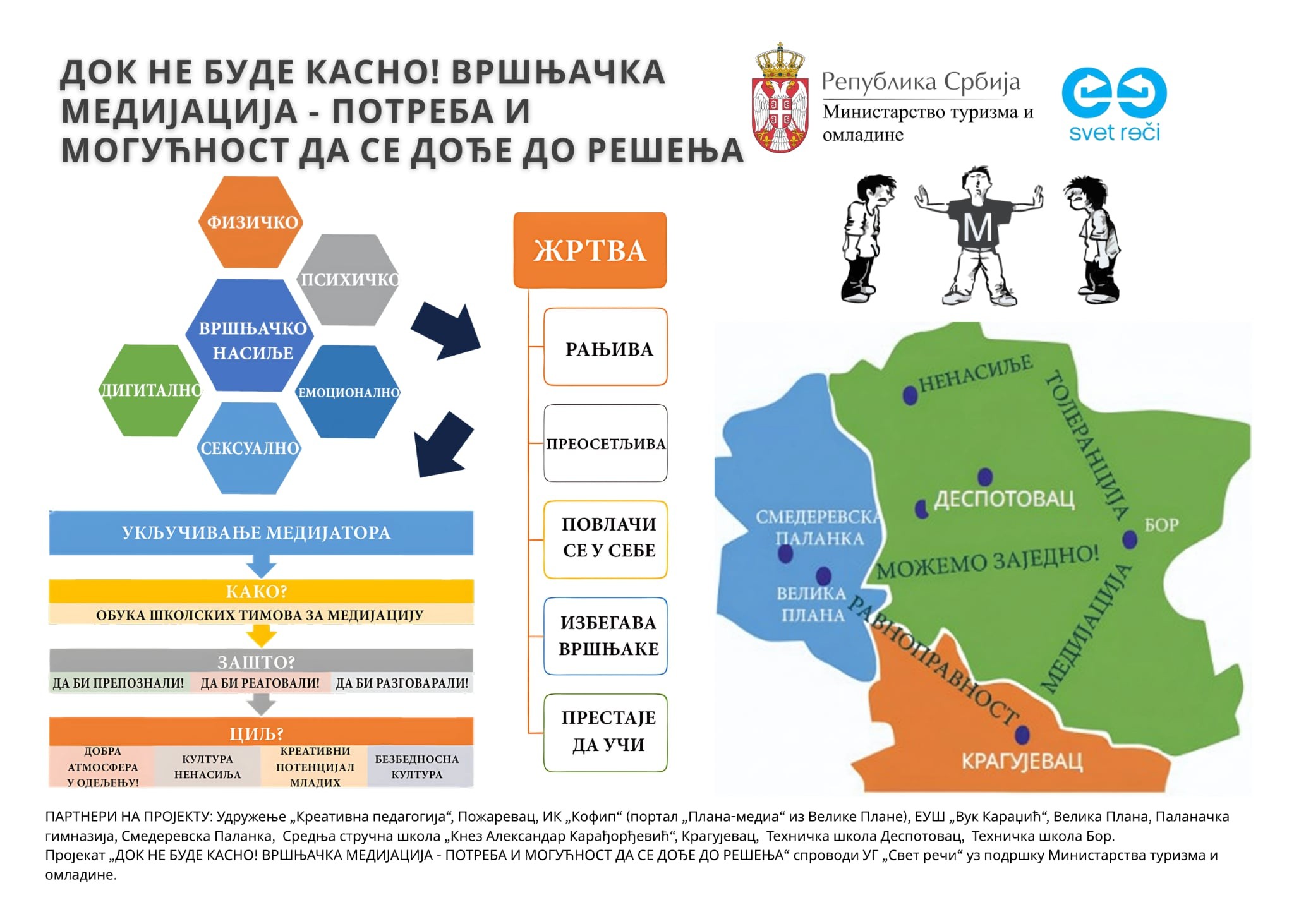 Пројекат „ДОК НЕ БУДЕ КАСНО! Вршњачка медијација - потреба и могућност доласка до решења“Датум: 09. Oktobar 2025 22:51 Категорија: 2025Пројекат „ДОК НЕ БУДЕ КАСНО! Вршњачка медијација - потреба и могућност доласка до решења“ спроводи Удружење „Свет речи“ из Велике Плане уз подршку Министарства туризма и омладине одржало је радионицу за ученике одељења 8/2 ОШ "Деспот Стефан Високи". Партнери у пројекту су Паланачка гимназија из Смедеревске Паланке, ТШ Бор, ТШ Деспотовац, ЕУШ „Вук Караџић“ и ТШ „Никола Тесла“ из Велике Плане, Средња стручна школа „Кнез Александар Карађорђевић“ и Школа за медицинске сестре „Сестре Нинковић“ из Крагујевца. |